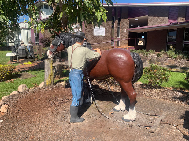 Located beside the Eacham Historical Society, the life-size sculptures of Harry and his Clydesdale horse, Nugget are depicted towing a slide, alongside Pooch, the dog. The creation of these sculptures was a labour of love, taking Viv a dedicated 7-month period between 1998 and 1999 to complete. The sculptures are a testament to her skill and creativity, constructed using a combination of chicken wire, fibreglass, and genuine horse riding equipment to achieve a lifelike appearance.